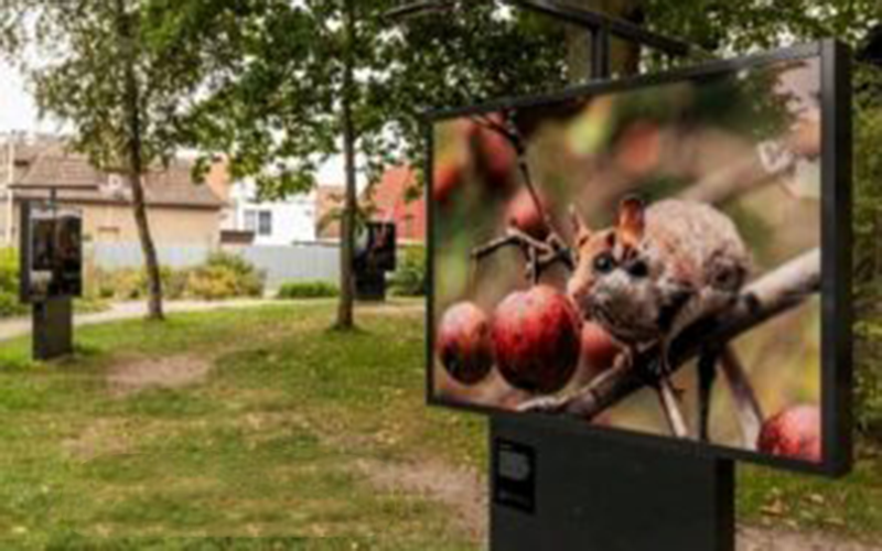 Echle’s intimate photographs of the flora and fauna native to the surrounding forests were showcased outdoors in the Postplatz, a small park in Zingst. In order to preserve Echle’s work for the duration of the exhibit, custom ChromaLuxe Outdoor panels were made to fit the requirements of the staging area. The panels were nestled between trees throughout the park.