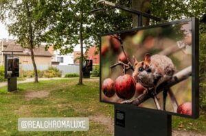 Every year they organize exhibitions with an environmental approach. One of the exhibitions this year is by Klaus Echle. It is an outdoor exhibition on the Postplatz. Postplatz is a small park where 9 large photo frames are placed between the trees. ChromaLuxe panels fit perfectly in these frames. They are custom-made for this exhibition. Photographs by Klaus Echle are sublimated on White Gloss ChromaLuxe Outdoor panels.