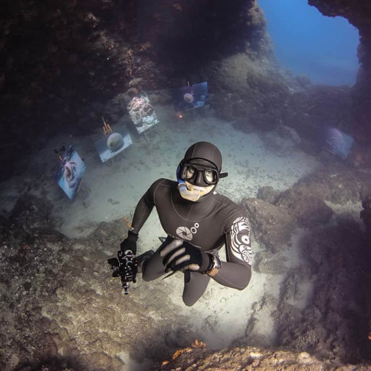 The Underwater Gallery, an installation art exhibit that takes place entirely underwater with photographs of the Greek underwater. Showcased on ChromaLuxe panels, surrounded by the deep blue of the Aegean sea. Are ChromaLuxe panels water-resistant? Yes, they are!