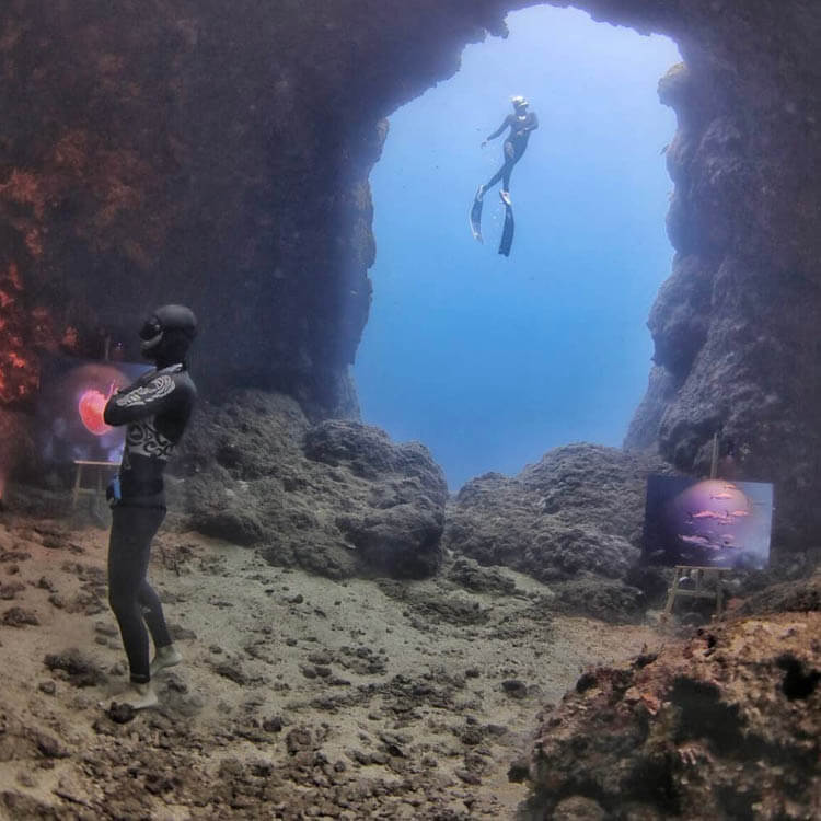 In a world first, the team of “on a single breath”  presented a unique photo exhibition in an undersea cave on the beautiful island of Amorgos. The Underwater Gallery was a special exhibition that took place in September 2018 in an amphitheater-shaped cavern. The artwork was exhibited at a depth of 7-17 meters. Special underwater lighting and ChromaLuxe metal prints created a one-of-a-kind experience for the exhibition guests.