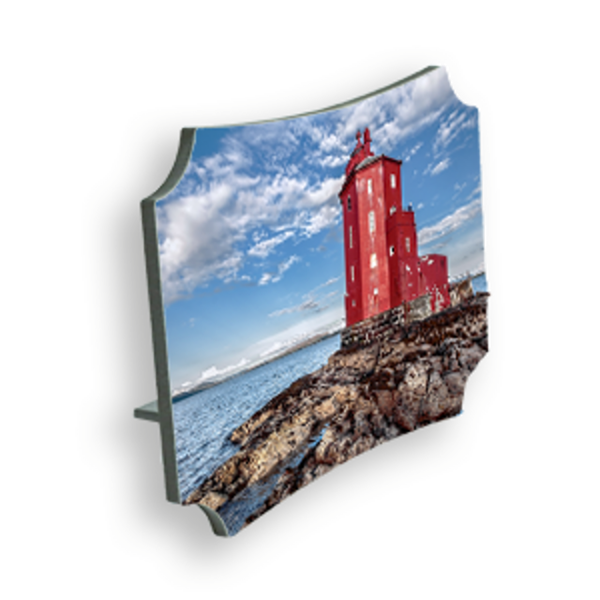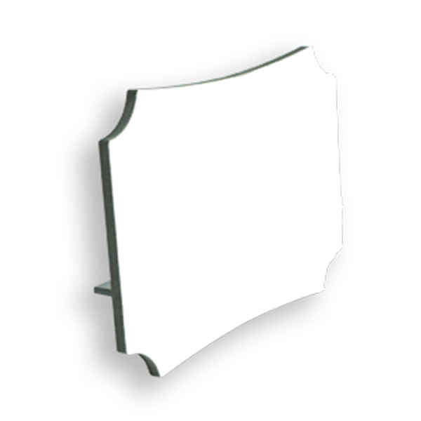 Gloss white, berlin shaped hardboard desktop photo panels with a dual keyhole and kickstand.